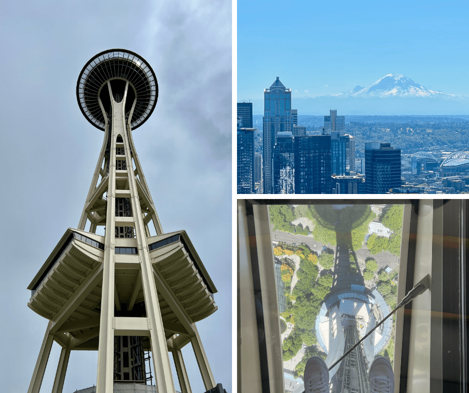 With the show almost an hour outside of Seattle in Snoqualmie, we stayed at a hotel halfway between the two in Issaquah. After driving back and forth on day one, I mentioned I was surprised we hadn’t seen Mt. Rainier, and chalked it up to being too far east and just not taking the right routes. But then day two on our way into downtown Seattle, there it was! I hadn’t even realized it had been too cloudy the day before. Our first stop downtown the second day was, appropriately, the Space Needle. I had driven by before, but had never gone up it. We lucked out with the perfect weather for the views; the lady operating the elevator told us you can actually only see Mt. Rainier about 90 days out of the whole year! I have a fairly new fear of heights, so I was anxious to step out onto the revolving glass floor. But once I took that first step I was fine (there’s a metaphor in there somewhere), and had fun taking pictures of the ground below.
