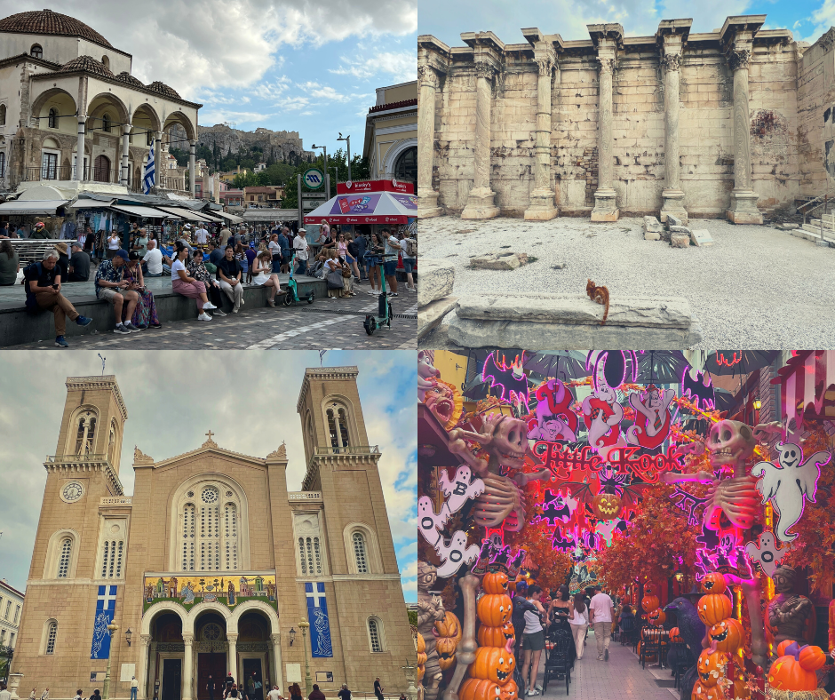 After dinner, we came across a group of maybe frat boys who were chanting and cheering for who knows what reason; it felt like the perfect “welcome to Greece” moment. From there, we wandered past Hadrian’s Library and The Metropolitan Cathedral of Athens on our way to get some treats from Little Kook on the edge of the Psiri neighborhood. Little Kook is known for its maximalist year-round seasonal decorations, and it was fun seeing it all decked out for Halloween. At this point our jet lag hit us just as rain started moving in, so from there we made a quick stop at a mini market for more snacks and had an early night back at our hotel.