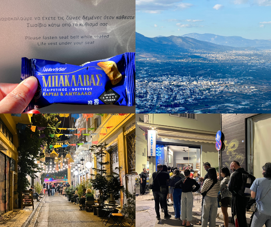 To get from Crete back to Athens, there are two options; 8 hour ferry, or 1 hour flight. We, of course, chose the flight. We flew out of Chania on Aegean airlines, which was my first time flying a domestic flight internationally (confusing sentence, I know). While certainly not the smallest airport I’ve been to (hello, Escanaba, Michigan), with only three gates it still makes the list. There are also no jet bridges, we walked out onto the tarmac and they loaded the plane with the stairs from both the front and back of the plane. They greeted us all with little gummy fruit candies, and our in-flight snacks were tiny prepackaged baklavas. There was less legroom than the standard U.S. airlines (Southwest, American, Delta), but with short legs and a short flight, it wasn’t a problem at all.