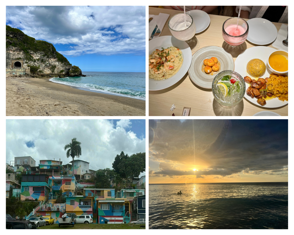 Monday morning, we picked up a rental car and drove about two hours west for a beach day. Along the way, we stopped at Túnel de Guajataca. It’s an old train tunnel that used to connect two towns, and it sits right on the edge of a beautiful beach full of coconut trees. As beautiful as it was, the waters there are too rough and dangerous for swimming, so we continued our way west toward Crash Boat Beach. Before dipping into the ocean, we stopped for lunch in a nearby town at Peña Blanca. We split the creamy shrimp rice, mofongo, cod fritters, pork and onions (a Puerto Rican friend told me this tastes like her childhood), and got drinks that turned out way larger than we anticipated.