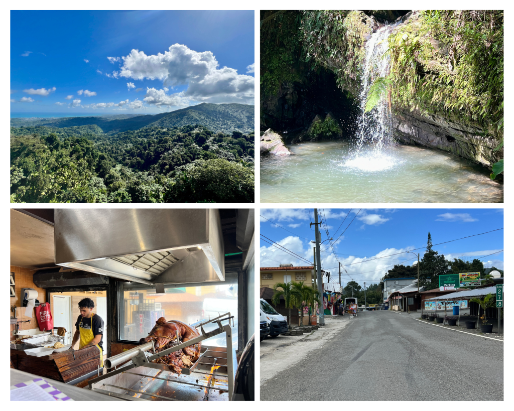 We had originally talked about going to Luquillo Beach on the way back after hiking, but then our Bacardi tour guide told us about “pork highway”, a mile-long stretch of road in the mountains in the middle of the island full of lechoneras. These are all big, open-air pig roasts, and while it was quiet for our Tuesday afternoon lunch, on weekends and in the evening they have big salsa parties, which would have been really fun to see. So, we opted to explore this and see a different side of the island in our limited time, rather than going to another beach after the previous day. We stopped at El Rancho Original and ordered pulled pork, “party rice” (rice with pigeon peas), and pasteles, which are a Puerto Rican version of tamales. Everything was delicious, and it was so fun driving through the smaller mountain towns to get there and back.